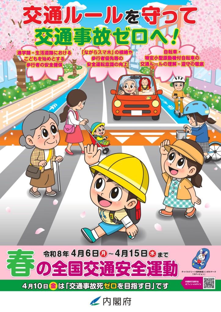 令和8年4月6日月曜日~4月15日水曜日までの10日間、春の全国交通安全運動が行われます。暖かい季節に移行し活動しやすくなりました。新しい年度を迎え新たに交通社会に踏み出した方もいます。 お互いに周囲の交通状況などに気を配り交通事故に遭わない、起こさないようにしましょう!